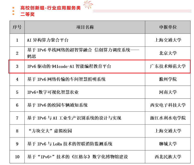 11月9日,由中国教育和科研计算机网CERNET网络中心主办的第二届IPv6技术应用创新大赛科教赛道暨第七届下一代互联网技术创新大赛圆满落幕。我院欧阳佳副教授带领的程子凡、李淳及余玉敏团队,其项目《IPv6驱动的941code-AI智能编程教育平台》在高校创新组-行业应用服务类中荣获二等奖。